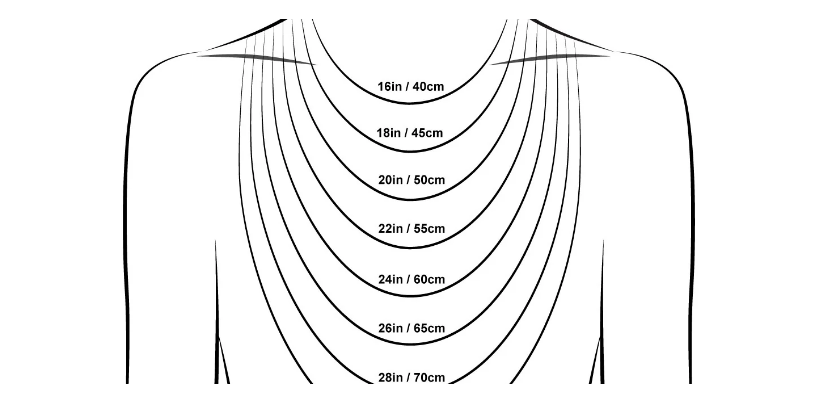 Use the visual guide below to see how standard chain lengths—from 16" (40 cm) to 30" (75 cm)—sit on the body, from collarbone-grazing to mid-chest drape.